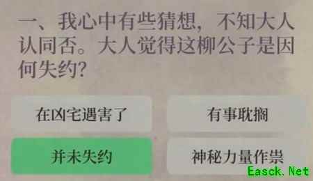 《江南百景图》失踪记答案一览一、我心中有些猜想,不知大人认同否。大人觉得这柳公子是因何失约? 选项:在凶宅遇害了、有事耽搁、并未失约、神秘力量作崇 答案:并未失约