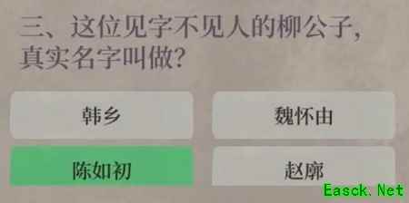 三、这位见字不见人的柳公子,真实名字叫做? 选项:韩乡、魏怀由、陈如初、赵廓 答案:陈如初