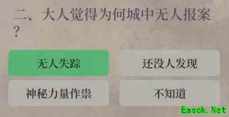 二、大人觉得为何城中无人报案? 选项:无人失踪、还没人发现、神秘力量作崇、不知道 答案:无人失踪