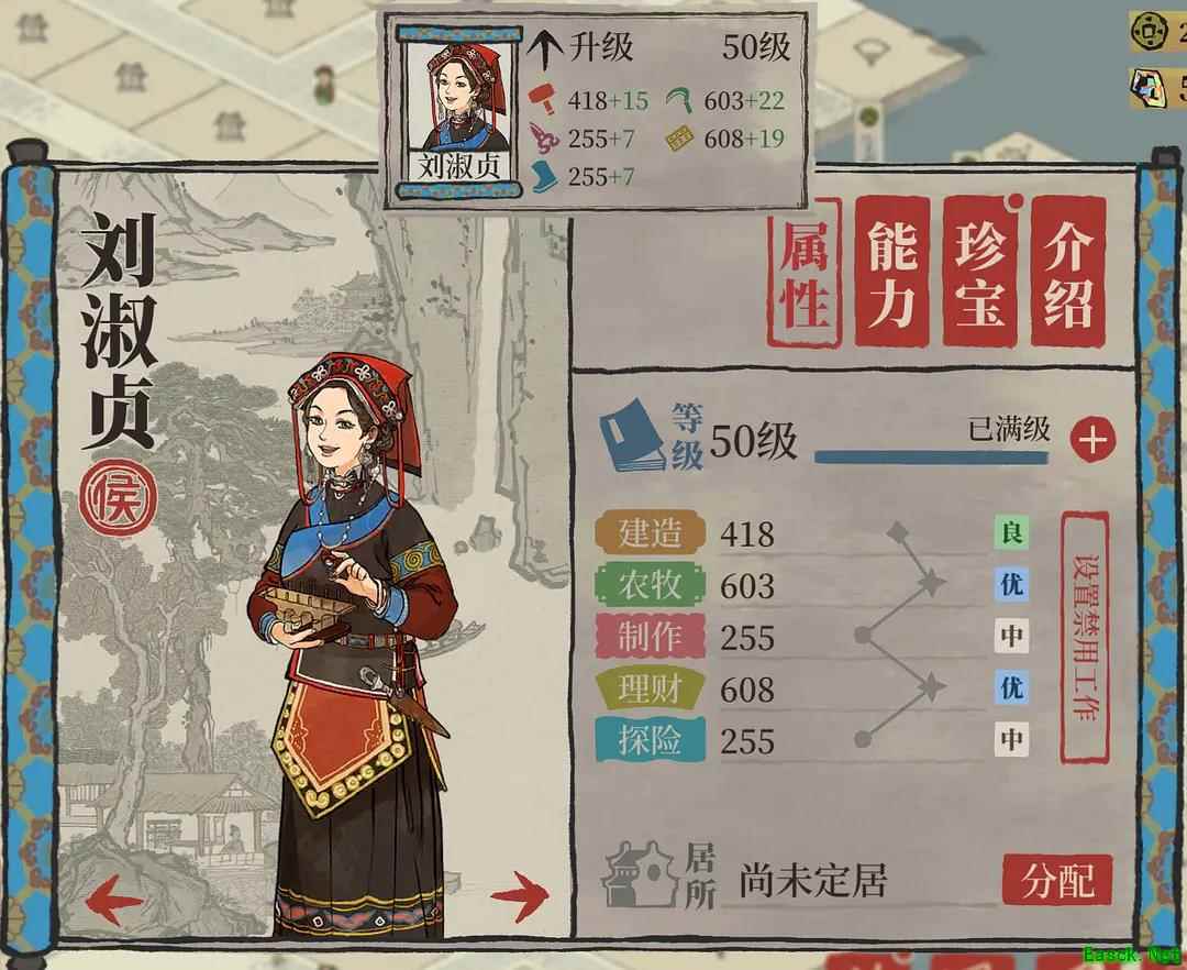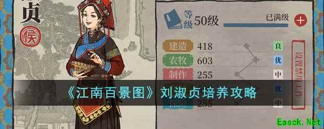 《江南百景图》刘淑贞培养攻略【人物属性】 初始属性:建造59,农牧84,制作52,理财97,探险52 满级属性:建造418,农牧603,制作255,理财608,探险255 【双倍书籍】 诗经、道德经