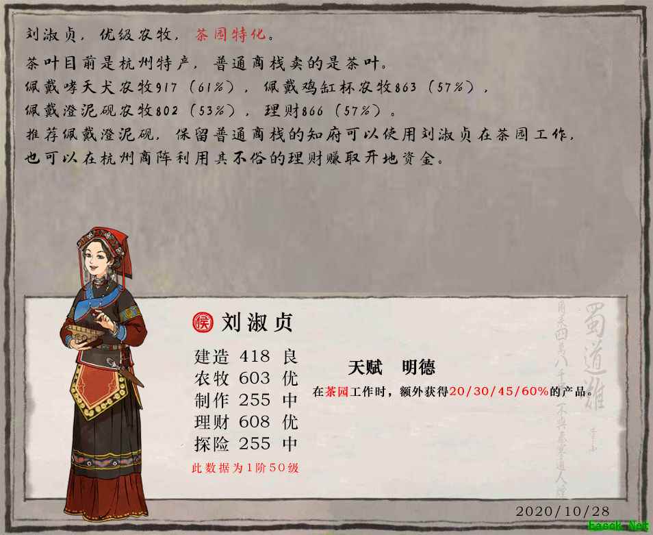 【天赋-明德】 在茶园工作时,额外获得20%/30%/45%/60%的产品。 【珍宝推荐】 哮天犬、鸡缸杯、澄泥砚(主农牧) 【人物简评】 1、双优一良优质侯,可以对标阿朵。 2、刘淑贞的面板感觉比天级秦桧还强,能力不错。 3、20%加成等于种茶时额外+300农牧,完爆贪官,可以说是杭州专属人物。