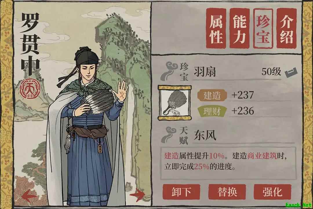 《江南百景图》徽州开荒角色推荐一览低估角色:罗贯中 1、罗贯中的面板和立绘看似平平无奇,但是建造工作减二人的天赋,非常适合开荒; 2、玩家早期开荒的时候,角色不够用,搭配满级的打神鞭减时间77%,真香。