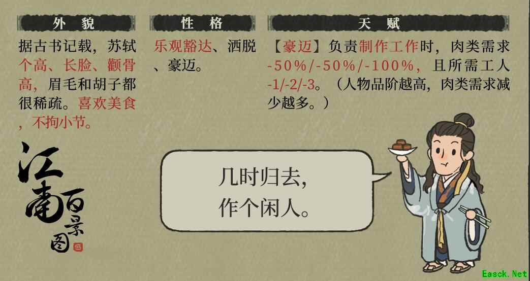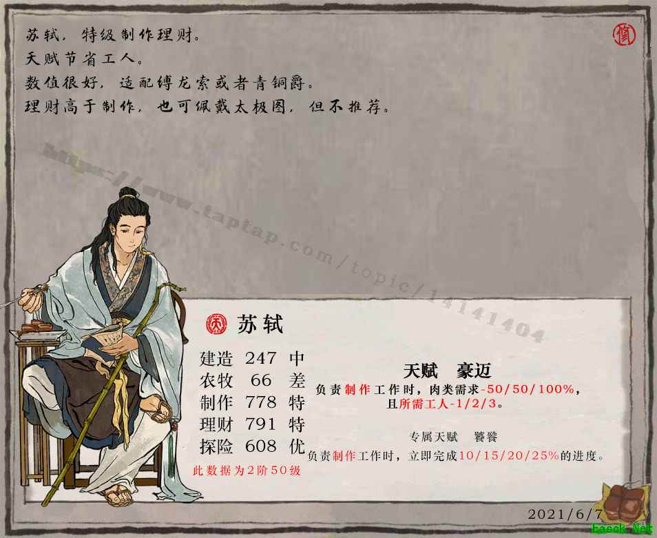 【双倍书籍】 暂无 【天赋-豪迈】 负责制作工作时,肉类需求-50%/无需肉类,且所需工人-1/-2/-3。 【珍宝推荐】 专珍:东坡肉 其他:缚龙索、青铜爵 【人物简评】 1、苏轼的理财属性高于制作,天赋比较一般,大家都不缺这点肉; 2、初代美食网红,小人比较丑,立绘还行,喜欢的可以抽。