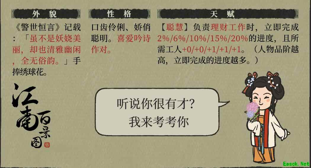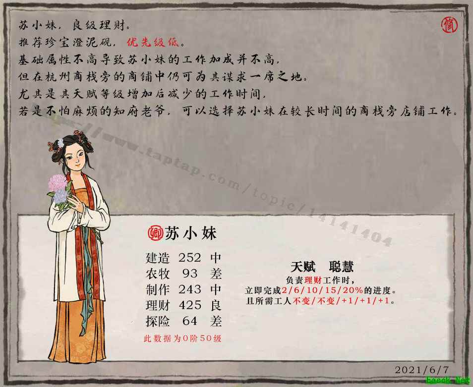 【双倍书籍】 史记、诗经 【天赋-聪慧】 负责理财工作时,立即完成2/6/10/15/20%的进度,且所需工人不变/不变/+1/+1/+1。 【珍宝推荐】 澄泥砚 【人物简评】 1、苏小妹的基础属性并不高,只有理财是良级的,优先级不高; 2、可以把她放在杭州商栈旁的商铺,减少工作的时间。