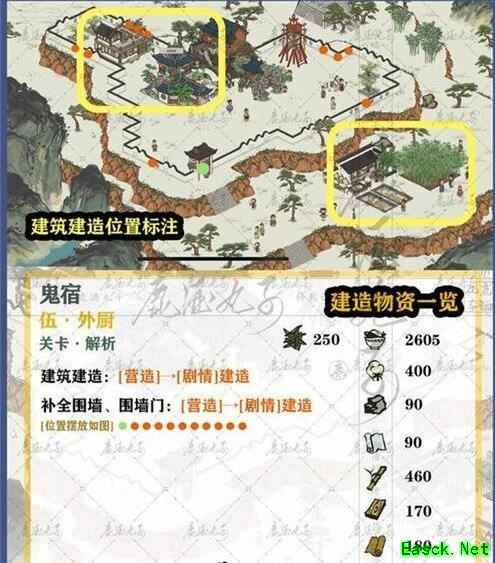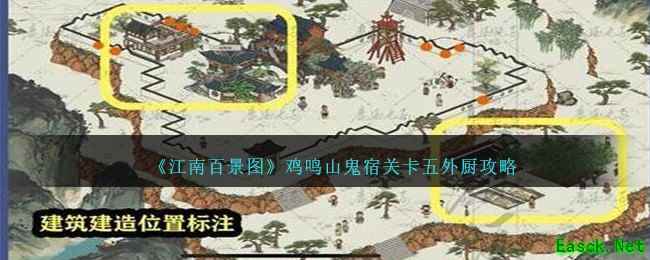 《江南百景图》鸡鸣山鬼宿关卡五外厨攻略1、江南百景图外厨建筑建造:营造→剧情建造 2、补全围墙、围墙门:营造→剧情建造 3、位置摆放如图: