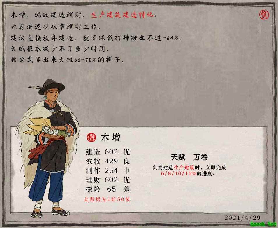 【双倍书籍】 天工开物、道德经 【天赋-万卷】 负责建造生产建筑时,立即完成6%的进度。 【珍宝推荐】 澄泥砚 【人物简评】 1、木增长相帅气,属性面板和冯梦龙有点类似,比不上文徵明; 2、木增的天赋虽然是建造,但是佩戴打神鞭的效果也一般,不如直接走理财工作。