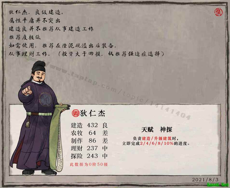 《江南百景图》狄仁杰培养攻略【人物属性】 初始属性:建造106,农牧10,制作22,理财28,探险,58 满级属性:建造432,农牧64,制作86,理财237,探险243 【双倍书籍】 三国志、史记 【天赋-藕霸】 负责建造/升级生产建筑时,立即完成10%的进度。 【珍宝推荐】 澄泥砚 【人物简评】 1、狄仁杰是很一般的卿级角色,适合用于建造,属性平庸不突出,一般不建议培养; 2、如果装备溢出,可以给他配个澄泥砚,狄仁杰的立绘比较可爱,像美有姬老师,来,试试看!