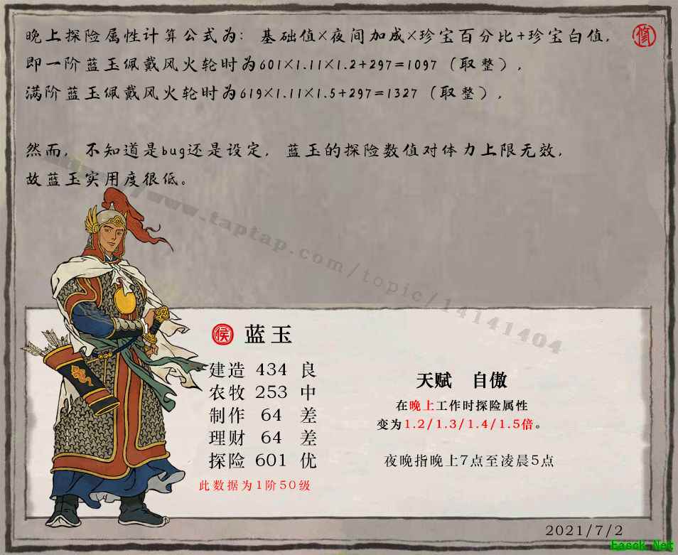 《江南百景图》蓝玉培养攻略【人物属性】 初始属性:建造183,农牧50,制作15,理财15,探险57 满级属性:建造434,农牧253,制作64,理财64,探险416 【双倍书籍】 暂无 【天赋-自傲】 在晚上工作时,探险属性变为1.2/1.3/1.41.5倍。 【珍宝推荐】 风火轮 【人物简评】 1、蓝玉是比较废物的角色,探险数值对体力上限无效,实用度非常低,几乎用不到; 2、非要用蓝玉,建议打开好友面板,把蓝玉设成头像,彰显美丽废物作用,头像是我,不满意?