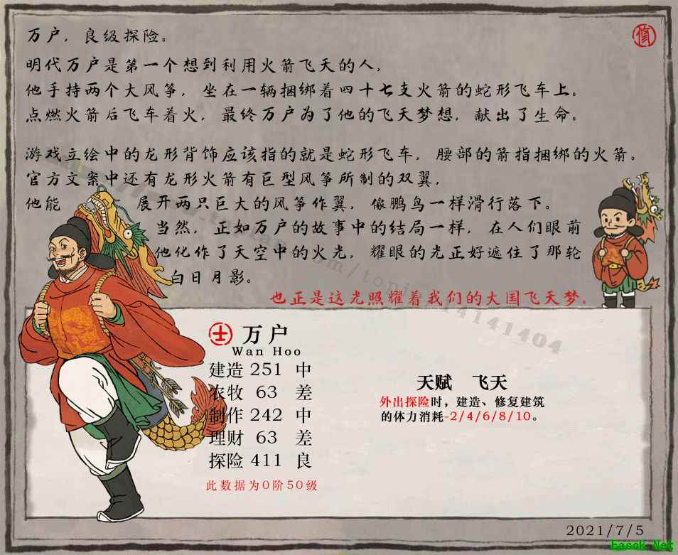 《江南百景图》万户培养攻略【人物属性】 初始属性:建造21,农牧5,制作25,理财5,探险25 满级属性:建造251,农牧63,制作242,理财63,探险411 【双倍书籍】 暂无 【天赋-飞天】 外出探险工作时,建造、修复建筑的体力消耗-2/4/6/8/10倍。 【珍宝推荐】 不配 【人物简评】 1、万户不值得培养,马文才终于不是唯一的士了; 2、万户兑换条件苛刻,还不如聂隐娘, 作为士级角色,只能跟马文才的5个铜板对标,换碎片也不要换万户啊!