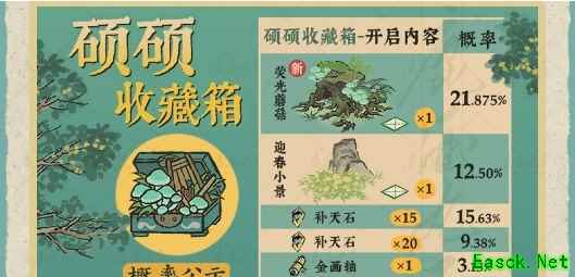 4、硕硕收集箱中的奖励有荧光蘑菇、迎春小景、补天石和金画轴等奖励。