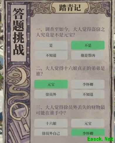江南百景图踏青记答案分享:1、江南百景图踏青记答案是:不是、元宝、李怀卿。 2、调查至如今,大人觉得盗窃之人究竟是不是元宝? 答案:不是 3、大人觉得十六娘真正的弟弟是谁? 答案:元宝 4、大人觉得徐员外丢失的财物最可能在谁手中? 答案:李怀卿 5、线索地点: 官府:元宝 仓库:徐员外 标布店:十六娘 畅音楼:李怀卿
