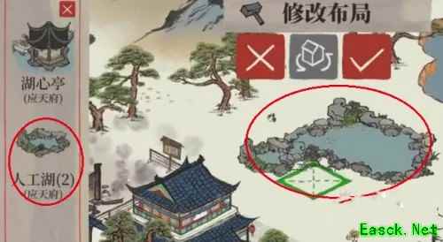 《江南百景图》湖心亭换位置方法1、在江南百景图中选择一个空白处,放置一个人工湖,调整好位置,点确定。