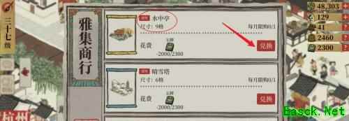 3、发现了令人心动的特色建筑【水中亭】。这个建筑需要花费【2000 玉牌】才能兑换。点击右侧那个兑换按钮。