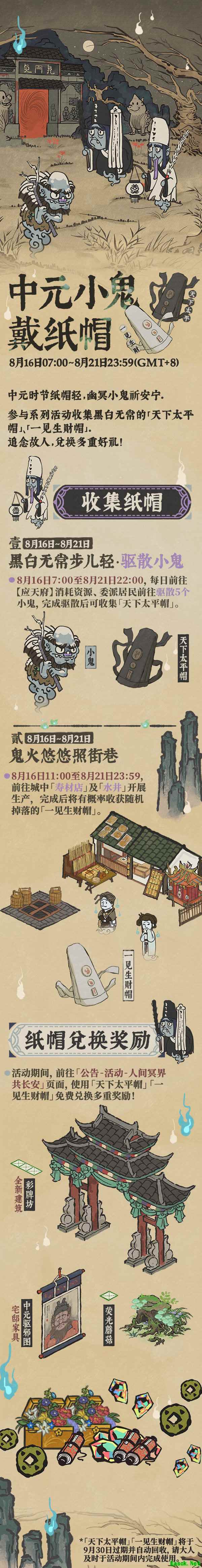 《江南百景图》中元小鬼戴纸帽活动玩法介绍8月16日起,前往#江南百景图#参与系列活动收集「天下太平帽」及「一见生财帽」,免费兑换全新1*3建筑「彩牌坊」等多重奖励! 【黑白无常步儿轻·驱散小鬼】 8月16日7:00(GMT+8)起,每日前往<应天府>消耗资源、委派居民前往驱散5个小鬼,完成后可收集「天下太平帽」。 【鬼火悠悠照街巷·生产限时掉落】 8月16日11:00(GMT+8)起,前往城中<寿材店>及<水井>开展生产,完成后将有概率收获随机掉落的「一见生财帽」。 【人间冥界共长安·限时奖励兑换】 8月16日11:00~8月21日23:59(GMT+8),前往<公告-活动-人间冥界共长安>页面,可使用「天下太平帽」及「一见生财帽」免费兑换全新1*3建筑「彩牌坊」、宅邸家具「中元驱邪图」、「建筑画轴」、「百花礼盒」等多重奖励,还请知府大人不要错过啦!