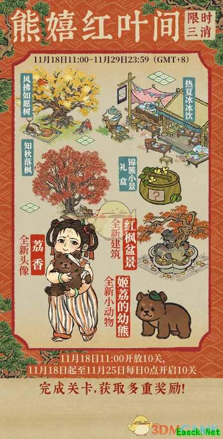 《江南百景图》江南荔枝香三消闯关挑战活动介绍熊嬉红叶间,闯关赢好礼。 「江南荔枝香」三消闯关挑战现已开启! 知府大人现可前往江南百景图,点击右侧「江南荔枝香」进入三消闯关挑战。 活动期间每日0点开放10关,达成通关成就即可将全新建筑「红枫盆景」、全新头像「荔香」、全新小动物「姬荔的幼熊」等多重奖励免费收入囊中!