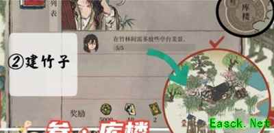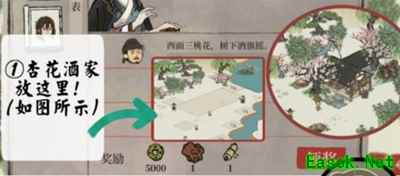 《江南百景图》星宿库楼任务完成攻略任务列表: 1、西面三桃花,树下酒旗摇, 2、在竹林间需多放些亭台美景(0/5), 3、极简茅房,可避风雨(0/2)。 4、小村子越来越热闹了(0/600) 完成方法: 1、杏花酒家放在如图位置,