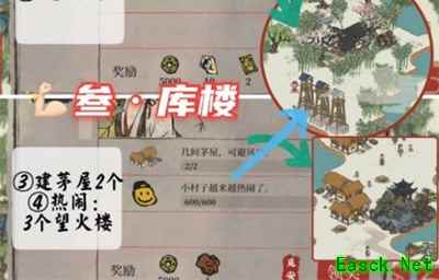 3、建茅房两个, 4、建造3个望火楼,达到600热度。