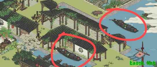 6、到达下图任务时,可顺便点击乌篷船,修复箭头废墟,找到第一个宝箱,按左下到达画图桌时,记得点击旁边的乌篷船;