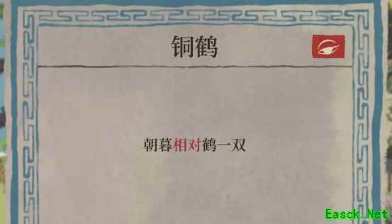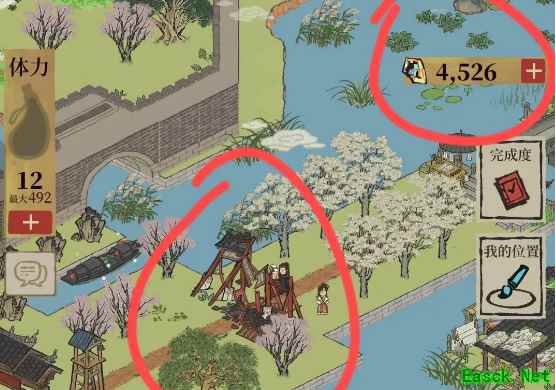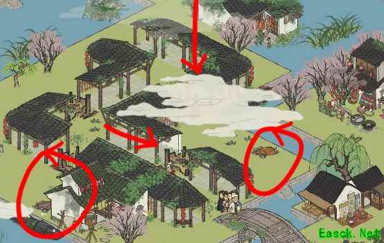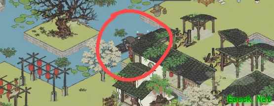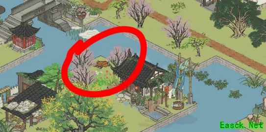 2、铜鹤相对,需按下图红箭头指引除去百合花和紫叶李到达铜鹤,其中所需玉山果需点击下图标出的发光乌篷船,可额外获得补天石;