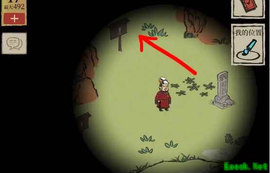 4、找杨梅看起来较难,其实很简单,到处走走总能找到,要找树上结红果的杨梅树,点击巨石或者杨梅树会缩小视野范围,其中发亮的地方是石碑可恢复视野,大概在原始位置左上角一点;