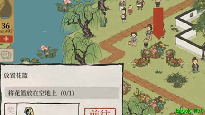 3、随后页面会弹出,“花篮已放在空地上”任务提示,最后就可以进行下一步操作。