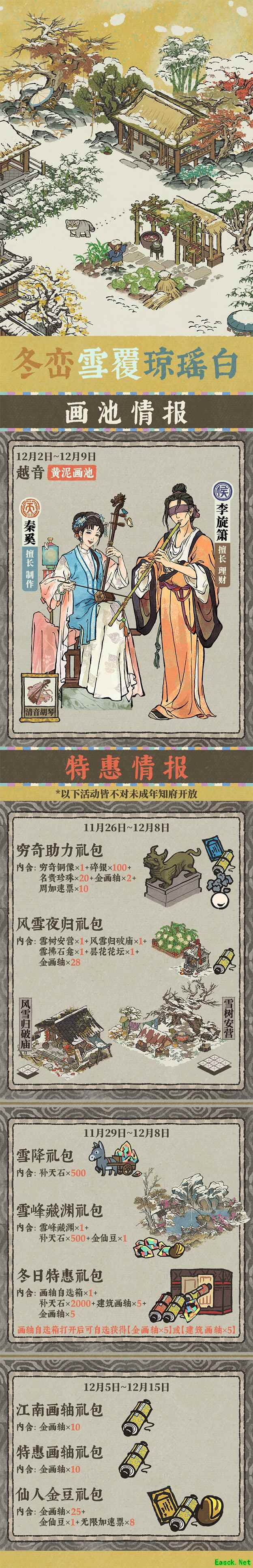 《江南百景图》冬峦雪覆琼瑶白玩法介绍冬峦雪覆琼瑶白 11月26日起,江南百景图开启全新活动日程!精彩抢先看- 全新居民「柳永」登场,可前往「杨柳画池」使用金画轴绘画获取。 全新动态建筑「日落雪山」及系列建筑「长生宫」「燃雪香炉」「不老山门」入驻,可参与期间活动获取。 严大人即将上架全新冬季建筑「茅舍听雪」「寒雪古木」「雪覆秋实」,12月5日起可与他相遇交易。更多活动详情请戳下方长图。 ❄11月26日起❄ 【寒雪夜弈对星辉·签到奖励】 活动期间,每日前往「签到奖励-限时」页面完成签到即可免费领取「建筑·雪屋夜棋」「建筑·小雪石」「补天石*30」等奖励。 ❄11月29日起❄ 【漕运往来通南北·限时漕运】 11.29~12.19前往「限时漕运」界面行驶漕船、运输资源。完成《药草图谱》收集后,11.29~12.22可前往【公告-活动-雪舍安居暖意融】兑换页下,消耗《药草图谱》免费获得全新2*3建筑「长生宫」、全新2*2建筑「燃雪香炉」及「不老山门」等奖励。 【白雪醉落梅·铜钱抽奖】 消耗铜钱即可免费参与抽奖!本次奖池内含「补天石*66」「建筑·山雪寨门」「金画轴」等奖励,全部奖品抽完后还将获得额外大奖建筑「庭霰落梅」。 【云影落雪山·限时累充】 累计充值补天石达到一定数额,最高可累计获得全新3*4动态建筑「日落雪山」、建筑「天青池」、「金画轴*30」等奖励。