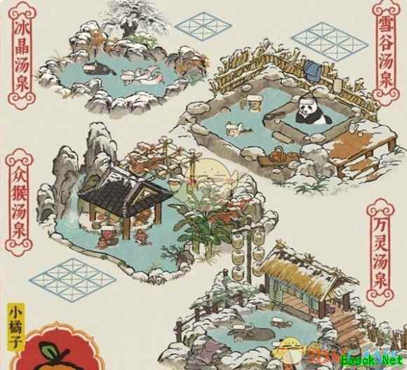 5、新增白雪镇4种限定小动物汤泉「冰晶汤泉」、「众猴汤泉」及「万灵汤泉」。 6、大人可在「营造-限定」中消耗汤泉石等材料建设,并使用各式浴药包进行调汤,接待江南小动物。 7、完成后可收获小动物们奉上的「小橘子」。 8、「小橘子」是探索建设汤泉乡的重要资源。