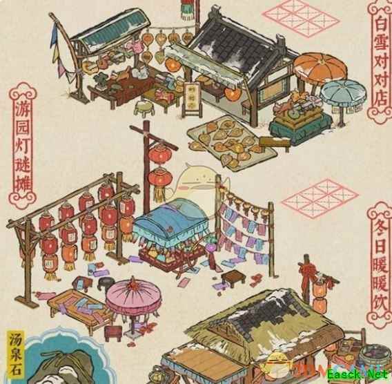 《江南百景图》4.4.0版本游园欢聚活动一览一、游园欢聚 1、新增白雪镇3种限定游园建筑「白雪对对店」「冬日暖暖饮」及「游园灯谜摊」。 2、在2025年1月26日至2月18日期间,点击建筑即可参与游园活动收集「汤泉石」,完成后可将游园建筑永久收入囊中。 3、「汤泉石」可用于建造小动物汤泉。