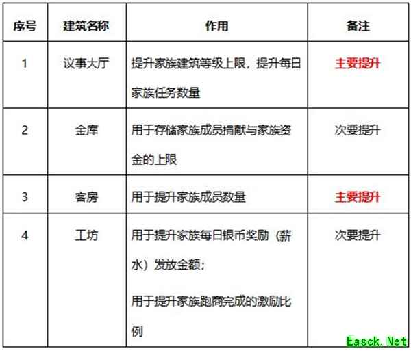 家族系统类似其他游戏中的工会、帮派,家族可使用家族成员捐献及完成任务所带来的建设资金提升家族建筑等级,并随着等级扩充家族成员数量。家族升级建筑主要包括如下内容:
