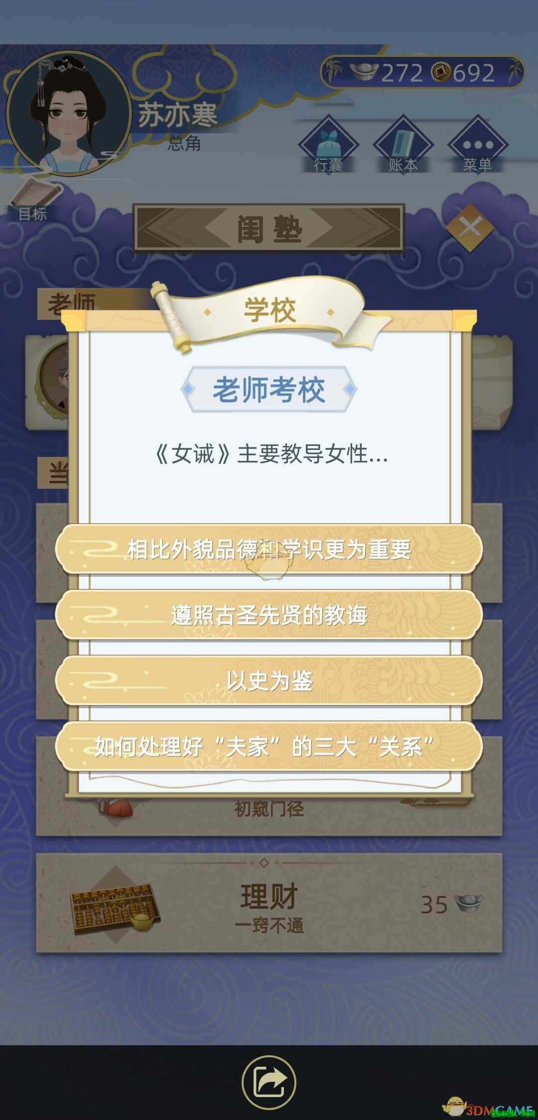古代人生手游中最新除了女性版,在游戏中玩家们是可以自己选择人生路线的, 还可以选择到学校学习,那么女诫主要教导女性什么呢?接下来小编就给大家带来了古代人生老师考校题目答案详解,快来一起看看吧!