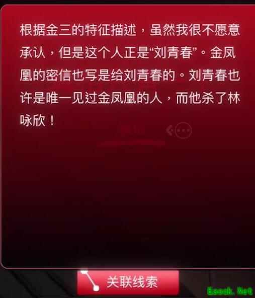 线索详情根据金三的特征描述,虽然我很不愿意承认,但是这个人这是“刘青春”。金凤凰的密信也是写给刘青春的。刘青春也许是唯一见过金凤凰的人,而他杀了林咏欣。