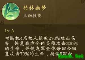 主动技能:随机对4名敌人造成270%的攻击伤害,回复全体英雄攻击220%的生命,每回合队友还会回复攻击70%的生命,持续5回合。