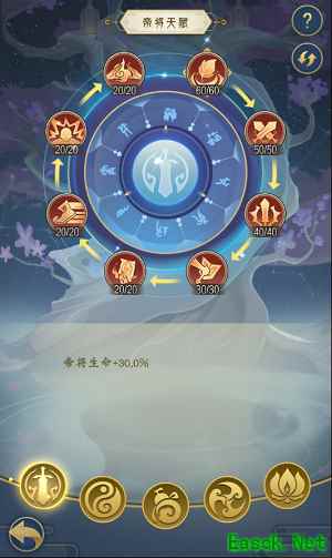天命官大人通关征战145关后解锁神兽系统,目前神兽系统中只有两只神兽,玉麒麟偏向于进攻,玄武偏向于防守。 神兽上场后会使战场上的英雄附带神兽光环,神兽光环可以提升英雄的攻击、生命、格挡、护甲等属性,并且神兽还拥有神兽技能,在战斗中蓄满能力槽就会激活神兽技能。 消耗铜钱和星辰精华可以提升神兽等级,随着神兽等级的提高,各项属性加成也会随之提高。 职业天赋 天命官大人通关征战95关后解锁建筑天命神树,天命神树中共五页天赋树,对应五种职业,每种天赋树相互独立,天赋可以为对应职业的英雄带来强大的属性加成,消耗铜钱和杨枝甘露可以升级天赋。