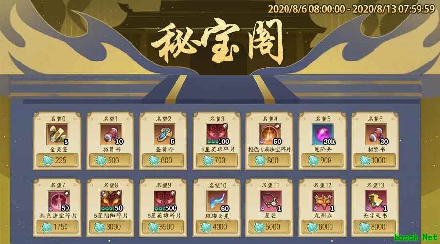 《千秋辞》8月6日更新内容一览2020活动时间 2020.08.06 08:00 - 2020.08.13 07:59 活动期间,每天登陆游戏可在邮箱领取【招贤书】*2 活动内容 招贤纳士 活动期间,消耗【招贤书】进行心愿召唤可获得积分,达到对应的积分即可领取相应的奖励。 本次招贤纳士活动只有进行心愿召唤才能获取积分哦~ 心愿召唤 本期心愿召唤迎来了一位新成员—苏轼。 心愿卡的领取方式有了调整,天命官大人不再从邮箱获取心愿卡。 进入心愿召唤界面可以查看心愿卡领取进度。 奖励双倍 活动期间,官府奖励、水月秘境战斗奖励和征战挂机的铜钱、经验丹双倍产出,道具、装备双倍掉落。 秘宝阁 秘宝阁首次现世,大量稀世珍宝公开于世。 天命官大人需达到对应名望,方可消耗【玉贝】进行购买。 每个道具只可购买1次。 圣皇宝库 武则天欲重掌天下,开放宝库换取资金。 本次圣皇宝库提供了2个档位的宝箱使用【玉贝】购买。 每个宝箱只可购买1次。 超值礼包 本周活动为各位天命官大人准备了5个档位的礼包。 除第5档礼包外,其他礼包可购买5次。 功能更新: 1、李清照加入高级召唤。 2、苏轼加入心愿召唤自选范围。 3、卜卦新增跳过动画功能。 4、新增战区查看功能,在服务器选择界面可查看当前的战区分组。