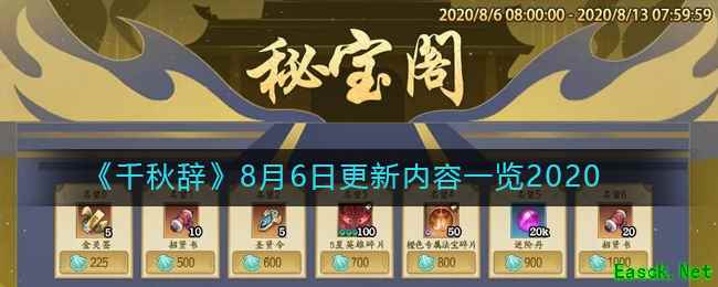 《千秋辞》游戏在8月6日这一天进行了版本更新,很多小伙伴都在关注这次的更新后会加入哪些全新的玩法和活动呢?距玩家爆料这次更新后会开放秘宝阁,而且还会将苏轼添加到心愿召唤的选择范围内,那么接下来小编为大家带来《千秋辞》8月6日更新内容一览2020,一起来看看吧。