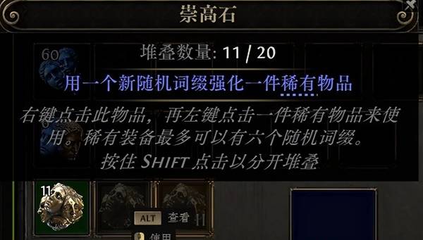 E 崇高石 (Exalted Orb) ,简称E 。基础计价通货,主要用于交易 低价物品。