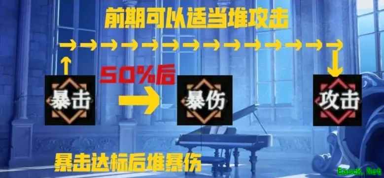 我们需要关注角色的暴击、暴伤、攻击的加成情况,暴击如果不够50%那么就是偏低的,则需要缺啥补啥通过套装效果,符石副属性为暴击属性加码。暴击达标后才考虑堆暴伤,但暴伤也是有范围的,按照游戏给的数值来分析,最高爆伤是350%而暴击是80%,爆伤值零就自带170%,所以按照标准惯例则是暴伤达到170%+暴击x2是最好的。而攻击力加成按目前理解最好就是适当堆,猛堆攻击暴伤至少要达到暴击50%之后。而暴击达到百分之五十后还要往上堆,就要注意暴伤是否符合公式是低了还是高了如果不符合公式,那还是堆攻击力提升最佳。 副属性分配: