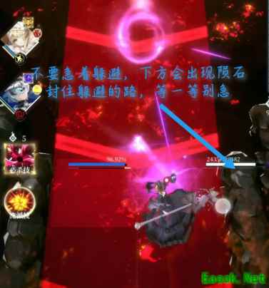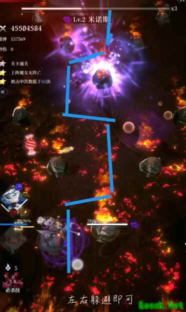 《爆裂魔女》米诺斯打法攻略一、第一阶段 1、肉弹冲击 米诺斯对中线大面积释放近身冲击,因为不是弹幕,所以清弹幕技能无效,同时两侧出现自下而上的陨石群,陨石群和中线部分的攻击会占满全部空间。 难点是中线部分的攻击会出红色的提示,这时基本都会向侧方移动,而陨石攻击是没有提示的,这时就已经躲不开了。 打法:不要着急躲,陨石和中线的攻击有一定的间隔,等红色的提示基本快消失,从下侧底线处向侧面躲避。