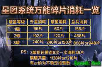 目前了解到最多玩家二破可以看到三破的消耗,因此小编将消耗列为图上的表,可以看出来一破二破翻倍的增长,三破虽然放缓但是仍然需要很多碎片, 目前可知三破最少都需要828片万能碎片。 四破就不敢想了,目前最多也只见到有人二破而已,而何时是尽头官方也没说。 对于平民玩家来说简直是天文数字了,要知道一个魔女从五星到六星也才288碎片了,升六星和这些比起来都只能说是才了。