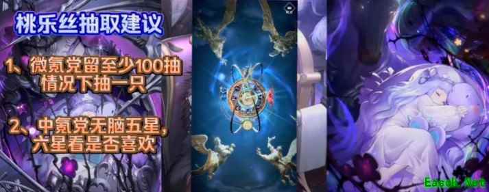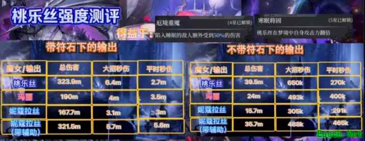 1.桃乐丝的输出可以说是一骑绝尘,并且也可以看出桃乐丝在没有放大招的秒伤还是很正常的,但是一放大招这秒伤就翻了一倍还多,所以桃乐丝输出还是靠大招。 2.而与另外两个魔女对比无论是带符石还是不带符石,都比妮蔻拉丝和玛丽高很多。就算带上爪妹和冰女辅助的妮蔻拉丝伤害也没能超过桃乐丝只能说是接近,所以桃乐丝带上了增伤辅助伤害只能更高。玛丽就不用说了整体星级技能对伤害提升都不高,依赖减防的辅助,而叠满三星技能也只能增伤30%,比不过桃乐丝的大招增伤离谱。 3.综上所述,桃乐丝可以说是目前当之无愧的暗系输出,同时也是魔弹系扛把子。但是毕竟铁打的辅助流水的c。 4.所以桃乐丝虽然强度还可以但是也没有到鸟笼的程度,所以不是中氪还是建议抽一只就好,观望一下新年池子两只的强度,那两只强度不行桃乐丝也可以万能碎片拉起来。 【抽取建议】
