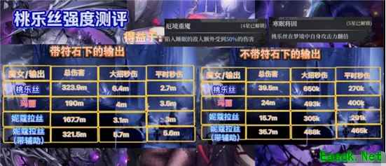 那我们不废话直接上图,从测试数据可以看出,桃乐丝的输出可以说是一骑绝尘,并且也可以看出桃乐丝在没有放大招的秒伤还是很正常的,但是一放大招这秒伤就翻了一倍还多,所以桃乐丝输出还是靠大招。 而与另外两个魔女对比无论是带符石还是不带符石,都比妮蔻拉丝和玛丽高很多,就算带上爪妹和冰女辅助的妮蔻拉丝伤害也没能超过桃乐丝只能说是接近,所以桃乐丝带上了增伤辅助伤害只能更高,玛丽就不用说了整体星级技能对伤害提升都不高,依赖减防的辅助,而叠满三星技能也只能增伤30%,比不过桃乐丝的大招增伤离谱。 综上所述桃乐丝可以说是目前当之无愧的暗系输出,同时也是魔弹系扛把子。但是毕竟铁打的辅助流水的c。 所以桃乐丝虽然强度还可以但是也没有到鸟笼的程度,所以不是中氪还是建议抽一只就好,观望一下新年池子两只的强度。那两只强度不行桃乐丝也可以万能碎片拉起来。 队伍配队 再就是桃乐丝的队伍配队了,作为一个合格的输出桃乐丝的队友肯定是增伤最佳,并且因为桃乐丝的五星技能为自身攻击力翻倍,所以娜塔莉娅后台加攻击力是必带的,其次还有一个位置,可以考虑带卡琳娜,必杀技释放还能再增加10%的攻击力,并且还能给敌人减防,而如果是打深夜这种限时的模式还是推荐带现在也还在up的奥莉维娅,能增伤同时还能延长深夜永久挑战时间,站场还可以回火快一些。所以桃乐丝配队和妮蔻拉丝一样为:娜塔莉娅、奥莉维娅或卡琳娜。而其他队友的能力对桃乐丝帮助就不算特别大,大家还有什么推荐的可以评论区交流。 抽取建议 分析了这么多,最后我们来说说到底该不该抽桃乐丝: