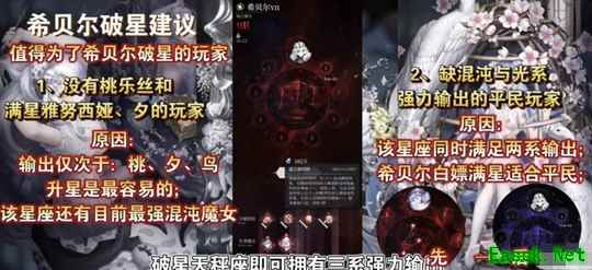 2、缺混沌和光系输出的平民玩家。 因为目前混沌输出牌面也就只有洛菲莉尔了,破星天秤座可以同时得到混沌毕业输出和光系顶级副c希贝尔,对于平民玩家来说只需要:先破星桃乐丝的水瓶座,再破星天秤座即可拥有三系强力输出,性价比还是很高的。