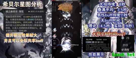 2、大招期间给敌人上易伤debuff,可叠15%的易伤。这算是希贝尔星图里关键提升伤害的技能。该易伤buff还是比较好叠的,平均释放大招后3.5秒即叠满,后面7.5秒都是满状态的,没有该buff加成的时间大概是九秒,之后大招好了就可以进行下一次循环。不过不知道是不是bug,技能描述处写的:希贝尔大招冷却时间为15秒,但是up实际使用希贝尔大招冷却时间却是19.5秒。如果是15秒的话希贝尔的易伤buff,真空时间还能缩短一半变为4.5秒。 又因为希贝尔的大招是可以切人继续使用的,所以这个buff也能给其他魔女享受。因此希贝尔还多出了一个辅助能力,所以本期也会评测:希贝尔辅助增伤能力到底如何。 再就是希贝尔二破增加的能力: 1、必杀期间全队攻击力提升10%持续10秒。 这一能力因为希贝尔大招真空期只有9秒左右,所以只要希贝尔大招不中断,基本就是常驻增伤了,并且这个全队加攻,可以说希贝尔朝着辅助之路又迈出了一步。 2、必杀期间暴击提升10%、易伤buff可以叠至20%。因为暴击只能给希贝尔加成,所以提升帮助也并不算大;而易伤增加15%其实也不算大,但是增强了希贝尔的辅助能力,希贝尔的队伍配队也多了一条道。 综上所述,希贝尔的星图由于多为全队共享能力,所以对自身输出的强化并不高,并且不知道是不是因为希贝尔是SR角色,所以希贝尔的星图强度总体也是比不上SSR的,因此希贝尔星图开启后更多的是倾向于成为一个副c的定位了,而具体哪些玩家值得破星,还需要探讨一下希贝尔的强度与辅助能力。 破星建议 总的来说希贝尔星图对输出能力提升不高,星图加成后希贝尔定位已经转为了副c。 因此值得为了希贝尔破星的玩家为: 1、没有桃乐丝、满星雅努西娅和夕的玩家。 因为没有这两个满星光系c和桃乐丝的玩家,想提升暗系输出就只能靠希贝尔了,并且希贝尔升星相比SSR容易许多,破星后还能让洛菲莉尔也享受到加成。