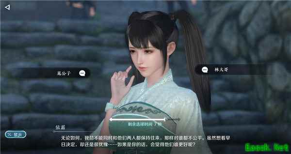 和依霜对话选择两个人时,有一个剩余选择时间,我截图错过了时间,应该是触发了第三种结局,两个人都不选择,选完可以在依霜附近听到浣纱歌,强烈建议打开声音,很好听!
