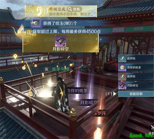 《逆水寒手游》江湖技能月影碎空获得攻略:1、我们前往甜水巷传送点,坐标1157,968),那里有一个宝箱,开启后可以拿到传闻。怡红背后的这个就是了。 2、这个传闻的意思是:甜水巷内小池东南,假山之上,双碟徘徊不去,或许是等待有缘之人。