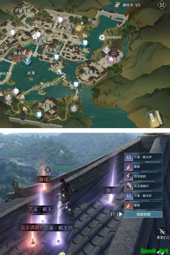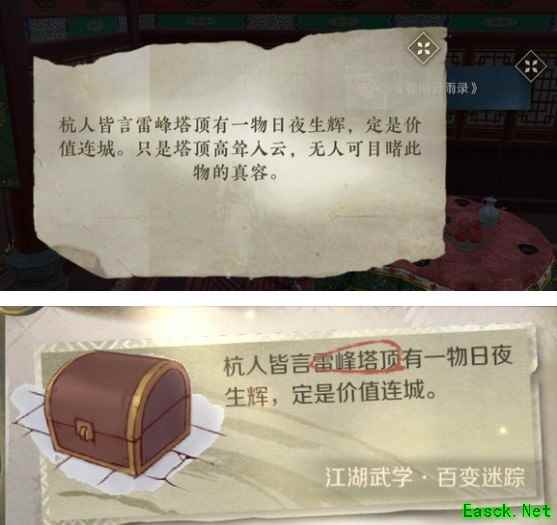 2、玩家开宝箱之后能看到线索:杭人皆言雷峰塔顶有一物日夜生辉,定是价值连城。只是塔顶高耸入云,无人可目睹此物的真容。 3、之后我们依据提示爬上雷峰塔的顶端,因为塔身较高,大家用钩锁、轻功或者直接做电梯上去皆可。 4、在顶部找到宝箱,打开以后就能获得“百变迷踪”了,这个技能可以变成游戏内各种NPC和玩家的样子。