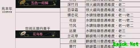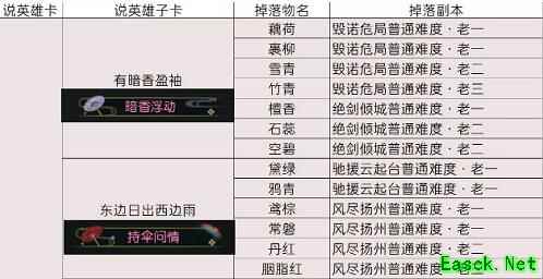 二、鹤唳蜀川 1、罗玉海:【油纸伞·点绿】、【油纸伞·兰花草】 2、花非花:腰挂【飞花引】、【油纸伞·墨竹】 3、两名首领均掉落:【油纸伞·水红染】、【油纸伞·青瓷染】、【油纸伞·莲灰染】、【油纸伞·绯红】、【油纸伞·鱼肚白】、【油纸伞·石青】、【油纸伞·竹月染】、【油纸伞·丁香染】、【油纸伞·鹅黄】、【油纸伞·薄樱草】 三、毁诺危局 1、苗八方:【油纸伞·藕荷】、【油纸伞·裹柳】 2、唐春雨:时装【千山雪·女】、【油纸伞·雪青】 3、叶棋五和齐文六:时装【千山雪·男】、【油纸伞·竹青】 4、三名首领均掉落:【油纸伞·水红染】、【油纸伞·青瓷染】、【油纸伞·莲灰染】、【油纸伞·绯红】、【油纸伞·鱼肚白】、【油纸伞·石青】、【油纸伞·竹月染】、【油纸伞·丁香染】、【油纸伞·鹅黄】、【油纸伞·薄樱草】 四、惊火藏鸣 【普通难度】 1、孙服缨:【油纸伞·茶白】 2、孙无恕:【油纸伞·深竹月】 3、雷一鸣:背挂【无常·白】、【油纸伞·百草霜】 4、三名首领均掉落:【油纸伞·水红染】、【油纸伞·青瓷染】、【油纸伞·莲灰染】、【油纸伞·绯红】、【油纸伞·鱼肚白】、【油纸伞·石青】、【油纸伞·竹月染】、【油纸伞·丁香染】、【油纸伞·鹅黄】、【油纸伞·薄樱草】 五、绝剑倾城 1、宁坎:腰挂【冰河】、【油纸伞·檀香】 2、萧离:【油纸伞·空碧】、【油纸伞·石蕊】 3、两名首领均掉落:【油纸伞·水红染】、【油纸伞·青瓷染】、【油纸伞·莲灰染】、【油纸伞·绯红】、【油纸伞·鱼肚白】、【油纸伞·石青】、【油纸伞·竹月染】、【油纸伞·丁香染】、【油纸伞·鹅黄】、【油纸伞·薄樱草】