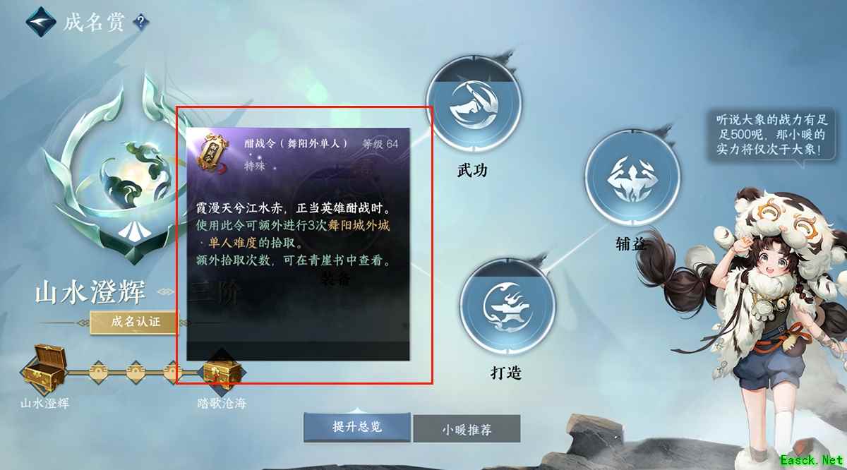 《逆水寒手游》舞阳城单人攻略:一、打法思路 首先角色界面-成名赏,修为达到36000可领取酣战令(单人); 如果你本来就有BOSS奖励没打完,参加单人模式优先消耗酣战令的奖励。