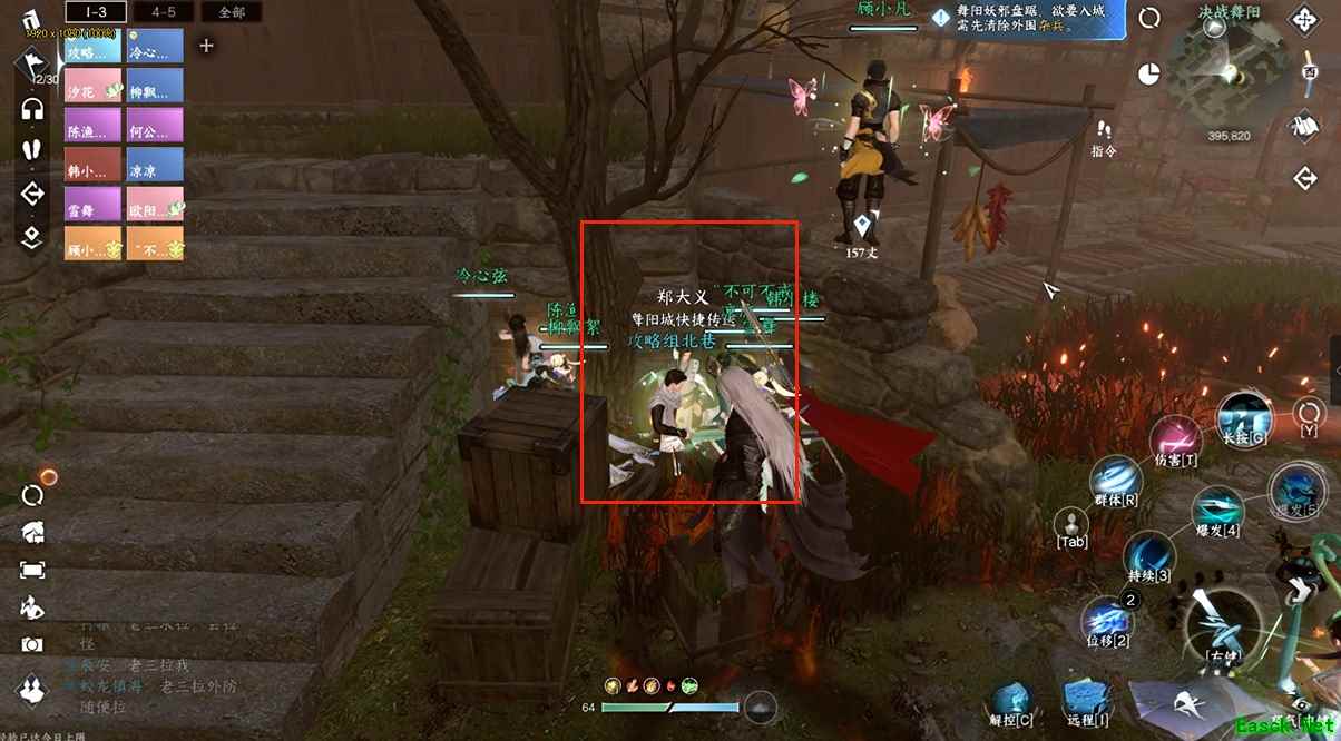 进入舞阳城外城后,老1/老2直接打就好了。 老3六尊使目前有逃课打法但是不知道什么时候会修复。 可能有部分玩家不熟悉外城的跑图,进本之后,点击人机指令-跟随,传送到瓮城。