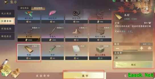2、染色需要消耗的【镜鉴】材料,学习【身份】-【装扮身份】,就可以制作【镜鉴】了,其中【镜鉴】的原材料【木材】除了可以通过【工艺身份】产出,也可以在【商城】-【集市】-【江湖身份】里直接购买;